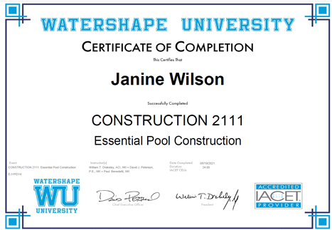 - Certified Pool Builder, APSP (Association Pool/Spa Pros)